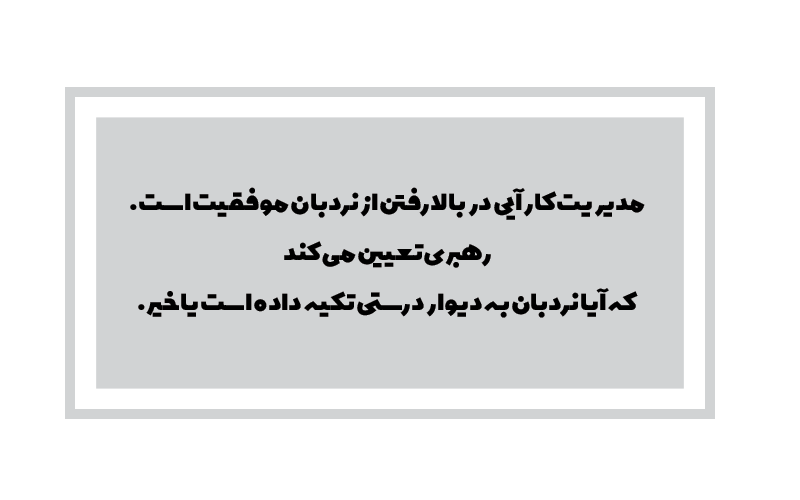این فرد حتما نباید در کارهای اجرایی مشارکتی فعال داشته باشد ؛ بلکه مهم این است که همواره جهت درست را انتخاب و مسیر را مشخص کند . دیگر نیروها و مدیران نیز باید سعی کنند که افرد پایینتر را به شکلی هدایت کنند که همه بتوانند به اهداف خود و آنچه برای سازمان لازم است دست پیدا کنند .»
